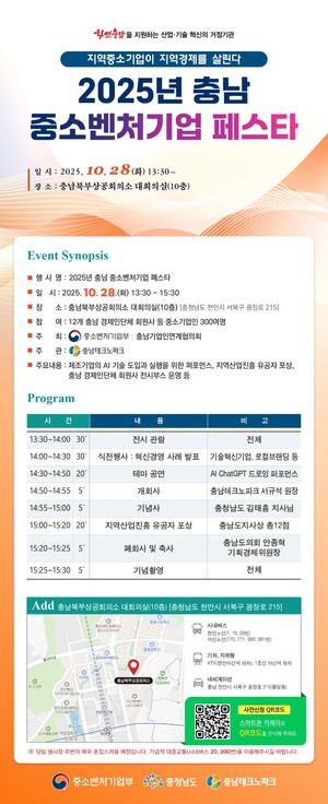 송고일 : 2025-10-21[에너지신문] (재)충남테크노파크(원장 서규석)는 도내 중소벤처기업의 혁신 성장과 상생 네트워크 강화를 위해 ‘2025 충남 중소벤처기업 페스타’를 28일 충남북부상공회의소 10층 대회의실에서 개최한다고 밝혔다.