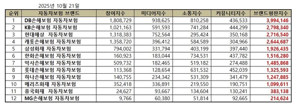 자동차보험 2025년 10월 브랜드평판...DB손해보험, KB손해보험, 현대해상 順 송고일 : 2025-10-21  자동차보험 10월 브랜드평판 빅데이터 분석 [에너지신문] 자동차보험 브랜드평판 2025년 10월 빅데이터 분석결과, 1위 DB손해보험 자동차보험 2위 KB손해보험 자동차보험 3위 현대해상 자동차보험 순으로 분석됐다. 자동차보험은 자동차 사고에 대비하기 위한 보험이다. 자동차 구입을 하면 의무적으로 가입하게 되어 있으며, 이를 어길 시 과태료를 부과하게 되어 있다. 2020년 자동차보험 시장 규모(원수보험료 기준)는 19조 6000억 원으로, 2019년 17조 5000억 원에 비해 11.6% 성장했다. 한국기업평판연구소는 2025년 9월 21일부터 2025년 10월 21일까지의 자동차보험 브랜드 빅데이터 21,353,145개를 소비자들의 참여, 미디어, 소통, 커뮤니티가치로 분류하고 평판알고리즘으로 분석하여 브랜드평판지수를 측정한 결과 지난 9월 자동차보험 브랜드평판 빅데이터 20,973,871개와 비교하면 1.81% 증가했다고 밝혔다. 2025년 10월 자동차보험 브랜드평판 순위는 DB손해보험, KB손해보험, 현대해상, 캐롯손해보험, 삼성화재, 한화손해보험, 악사손해보험, 롯데손해보험, 하나손해보험, 메리츠화재, 흥국화재, MG손해보험 자동차보험 순이었다. 자동차보험 브랜드평판 1위를 기록한 DB손해보험 자동차보험 브랜드는 참여지수 1,808,729 미디어지수 938,625 소통지수 810,258 커뮤니티지수 436,533이 되면서 브랜드평판지수 3,994,146으로 분석됐다. 지난 9월 브랜드평판지수 3,245,582와 비교해보면 23.06% 상승했다. 2위, KB손해보험 자동차보험 브랜드는 참여지수 1,021,163 미디어지수 591,593 소통지수 741,284 커뮤니티지수 444,299가 되면서 브랜드평판지수 2,798,340으로 분석됐다. 지난 9월 브랜드평판지수 2,543,083과 비교해보면 10.04% 상승했다. 3위, 현대해상 자동차보험 브랜드는 참여지수 1,318,383 미디어지수 752,564 소통지수 295,424 커뮤니티지수 350,168이 되면서 브랜드평판지수 2,716,540으로 분석됐다. 지난 9월 브랜드평판지수 3,153,319와 비교해보면 13.85% 하락했다. 4위, 캐롯손해보험 자동차보험 브랜드는 참여지수 1,358,720 미디어지수 396,412 소통지수 584,589 커뮤니티지수 304,966이 되면서 브랜드평판지수 2,644,687로 분석됐다. 지난 9월 브랜드평판지수 2,454,109와 비교해보면 7.77% 상승했다. 5위, 삼성화재 자동차보험 브랜드는 참여지수 794,002 미디어지수 331,794 소통지수 403,199 커뮤니티지수 397,440이 되면서 브랜드평판지수 1,926,435로 분석됐다. 지난 9월 브랜드평판지수 2,354,056과 비교해보면 18.17% 하락했다.   한국기업평판연구소 구창환 소장은 "자동차보험 브랜드평판 2025년 10월 브랜드 빅데이터 분석결과, DB손해보험 자동차보험 브랜드가 1위를 기록했다. 자동차보험 브랜드 카테고리를 분석해보니 지난 9월 자동차보험 브랜드 빅데이터 20,973,871개와 비교하면 1.81% 증가했다. 세부 분석을 보면 브랜드소비 14.70% 상승, 브랜드이슈 1.21% 상승, 브랜드소통 2.37% 상승, 브랜드확산 16.80% 하락했다."라고 평판 분석했다.
