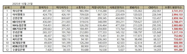 은행 2025년 10월 브랜드평판...하나은행, 아이엠뱅크, 신한은행 順 송고일 : 2025-10-21  은행 10월 브랜드평판 빅데이터 분석 [에너지신문] 은행 브랜드평판 2025년 10월 빅데이터 분석결과, 1위 하나은행 2위 아이엠뱅크 3위 신한은행 순으로 분석됐다. 한국기업평판연구소는 2025년 9월 21일부터 2025년 10월 21일까지의 은행 브랜드 빅데이터 20,853,308개를 분석하여 소비자들의 은행 브랜드 소비행태를 알아낸 결과 지난 9월 은행 브랜드 빅데이터 15,908,764개와 비교하면 31.08% 증가했다고 밝혔다. 2025년 10월 은행 브랜드평판 빅데이터 분석 순위는 하나은행, 아이엠뱅크, 신한은행, KB국민은행, NH농협은행, IBK기업은행, 우리은행, 수협은행, 씨티은행, SC제일은행, KDB산업은행, 수출입은행 순이었다. 은행 브랜드평판 1위를 기록한 하나은행 ( 대표 이호성 ) 브랜드는 참여지수 497,391 미디어지수 557,700 소통지수 965,994 커뮤니티지수 1,110,288 사회공헌지수 272,816 ESG지수 135,063 CEO지수 202,061이 되면서 브랜드평판지수 3,741,313으로 분석됐다. 지난 9월 브랜드평판지수 2,175,686과 비교해보면 71.96% 상승했다. 2위, 아이엠뱅크 ( 대표 황병우 ) 브랜드는 참여지수 424,778 미디어지수 426,191 소통지수 709,028 커뮤니티지수 867,129 사회공헌지수 220,439 ESG지수 120,025 CEO지수 226,544가 되면서 브랜드평판지수 2,994,133으로 분석됐다. 지난 9월 브랜드평판지수 2,533,102와 비교해보면 18.20% 상승했다. 3위, 신한은행 ( 대표 정상혁 ) 브랜드는 참여지수 422,812 미디어지수 800,607 소통지수 573,089 커뮤니티지수 299,345 사회공헌지수 434,893 ESG지수 174,961 CEO지수 153,457이 되면서 브랜드평판지수 2,859,164로 분석됐다. 지난 9월 브랜드평판지수 2,293,148과 비교해보면 24.68% 상승했다. 4위, KB국민은행 ( 대표 이환주 ) 브랜드는 참여지수 436,041 미디어지수 211,003 소통지수 319,616 커뮤니티지수 348,099 사회공헌지수 393,211 ESG지수 759,627 CEO지수 320,873이 되면서 브랜드평판지수 2,788,471로 분석됐다. 지난 9월 브랜드평판지수 1,830,951과 비교해보면 52.30% 상승했다. 5위, NH농협은행 ( 대표 강태영 ) 브랜드는 참여지수 154,451 미디어지수 380,451 소통지수 526,292 커뮤니티지수 636,464 사회공헌지수 477,200 ESG지수 213,229 CEO지수 295,595가 되면서 브랜드평판지수 2,683,683으로 분석됐다. 지난 9월 브랜드평판지수 2,707,385와 비교해보면 0.88% 하락했다.   한국기업평판연구소 구창환 소장은 "은행 브랜드평판 2025년 10월 브랜드 빅데이터 분석결과, 하나은행 ( 대표 이호성 ) 브랜드가 1위를 기록했다. 은행 브랜드 카테고리를 분석해보니 지난 9월 은행 브랜드 빅데이터 15,908,764개와 비교하면 31.08% 증가했다. 세부 분석을 보면 브랜드소비 34.01% 상승, 브랜드이슈 31.87% 상승, 브랜드소통 42.60% 상승, 브랜드확산 46.24% 상승, 브랜드공헌 12.11% 상승, ESG평가 11.00% 상승, CEO평가 26.47% 상승했다."라고 평판 분석했다. 이어 " 2025년 10월 은행 브랜드평판 1위를 기록한 하나은행 브랜드는 링크분석에서 '협약하다, 출시하다, 지원하다'가 높게 나왔고, 키워드 분석에서는 '중소기업 특별자금, 농구응원적금, 가상자산 시세조회'가 높게 나왔다. 긍부정비율 분석에서는 90.51% 긍정비율로 분석됐다"라고 브랜드 분석했다.