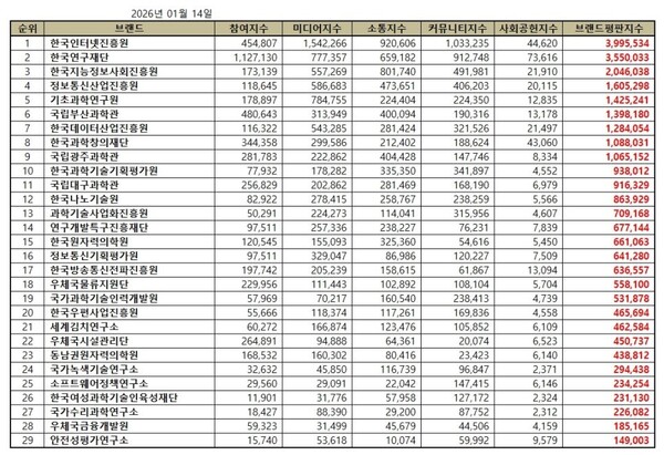 한국기업평판연구소는 과학기술정보통신부 공공기관 29개 브랜드에 대해 2025년 12월 14일부터 2026년 1월 14일까지의 과학기술정보통신부 공공기관 브랜드 빅데이터 27,728,921개를 분석한 결과 지난 12월 과학기술정보통신부 공공기관 브랜드 빅데이터 24,029,135개와 비교하면 15.40% 증가했다고 밝혔다.
