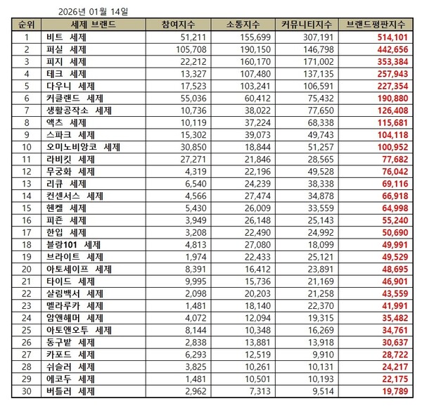 2026년 1월 세제 브랜드평판 순위는 비트, 퍼실, 피지, 테크, 다우니, 커클랜드, 생활공작소, 액츠, 스파크, 오미노비앙코, 라비킷, 무궁화, 리큐, 컨센서스, 헨켈, 피죤, 한입, 블랑101, 브라이트, 아토세이프, 타이드, 살림백서, 멜라루카, 암앤해머, 아토앤오투, 동구밭, 카포드, 쉬슬러, 에코두, 버틀러 세제 순으로 나타났다.