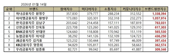 한국기업평판연구소는 2025년 12월 14일부터 2026년 1월 14일까지 금융지주회사 CEO 브랜드 빅데이터 5,847,835개를 분석하여 소비자들의 참여와 미디어, 소통, 커뮤니티, 사회공헌, 소비자지표로 금융지주회사 CEO 브랜드평판지수를 산출한 결과 지난 12월 금융지주회사 CEO 브랜드 빅데이터 5,715,602개와 비교하면 2.31% 증가했다고 밝혔다.