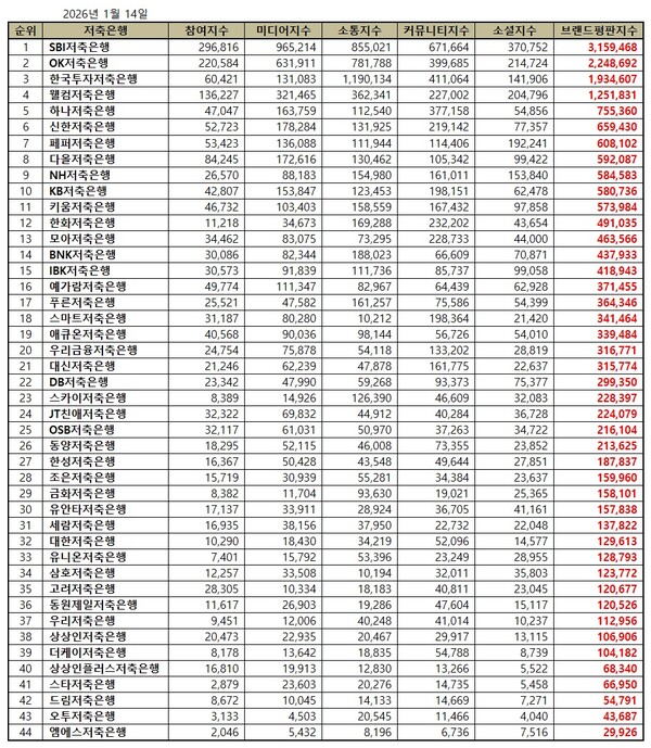 한국기업평판연구소는 소비자들에게 사랑받는 44개 저축은행 브랜드에 대해 2025년 12월 14일부터 2026년 1월 14일까지 저축은행 브랜드 빅데이터 20,003,883개를 분석한 결과 지난 12월 저축은행 브랜드평판 빅데이터 20,298,816개와 비교해보면 1.45% 줄어들었다고 밝혔다.