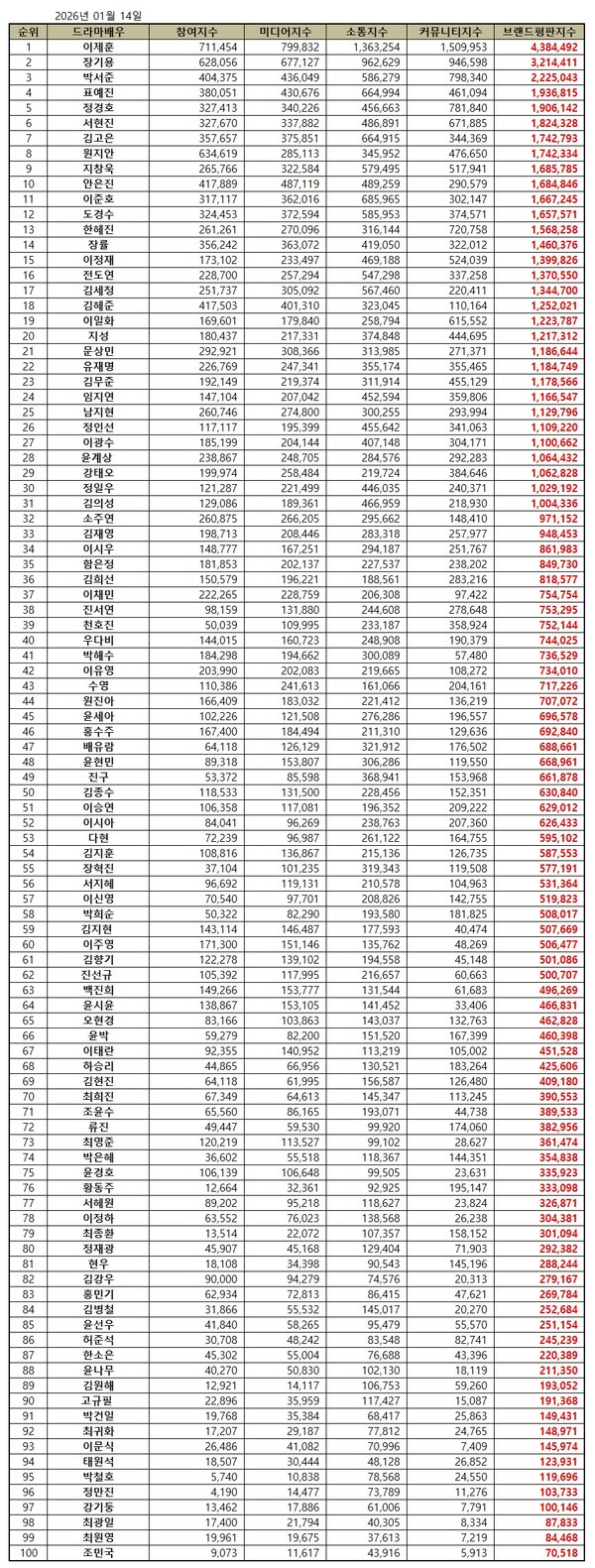 한국기업평판연구소는 2025년 12월 14일부터 2026년 1월 14일까지 방영한 드라마에 출연중인 배우 100명의 브랜드 빅데이터 80,187,626개를 소비자들의 브랜드 참여량, 미디어량, 소통량, 커뮤니티량으로 측정하여 브랜드평판 알고리즘으로 지수화한 결과 지난 12월 드라마 배우 브랜드 빅데이터 95,133,320개와 비교하면 15.71% 줄어들었다고 밝혔다.