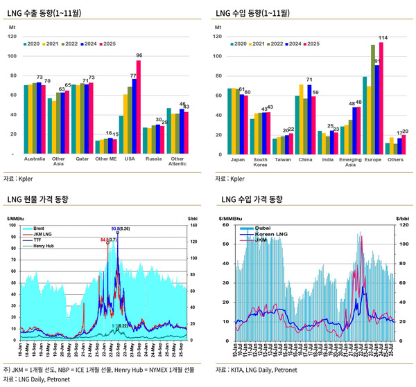 2024년 LNG 수입이 급감했던 유럽은 지난 동절기 둥켈플라우테 현상으로 인한 재생에너지 발전 감소와 2025년 2월 한파로 인해 가스 재고가 빠르게 소진되어 재고 비축 수요가 급증하였고 2025년부터 우크라이나 경유 러시아산 PNG 수송(15bcm/y)이 중단됨에 따라 2025년 11월까지 LNG 수입이 전년 동기 대비 25% 이상 급증(+23백만톤)하였다.