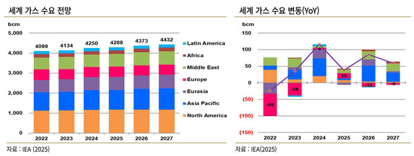 더욱이 전반적인 AI 및 반도체 등 첨단 산업의 투자가 확대될 전망임에도 불구하고 관세의 가격 전이 본격화, 중동․러우․중일 지정학적 위험, 소강상태인 미중 무역 전쟁 격화, 유럽 중심국(영, 프, 독)의 재정 건전성 위기, 중국의 경기 부진 지속, AI 버블 붕괴 우려 등 다양한 세계 경기 하방 압력이 상존한다.◆ 천연가스 수요