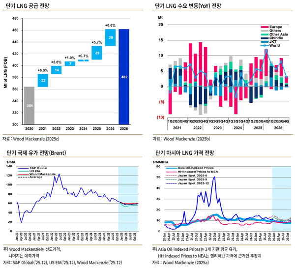 2026년에는 전년도에 신규 가동된 설비들의 생산 정상화와 함께 현재 시험 가동 중인 LNG Canada 2호 트레인 및 오랜 동안 지연되어왔던 Golden Pass(18백만톤/년) 프로젝트가 연초부터 단계적으로 가동될 예정일 뿐만 아니라 카타르의 NFE(32백만톤/년) 프로젝트가 3분기부터 단계적으로, 호주 Pluto 확장 프로젝트(5백만톤/년)가 4분기에 가동될 전망이다. 한편 현재 진행 중인 러-우 평화 협정이 체결되어 서방의 대러 제재가 해제될 경우 Arctic LNG-2(1~2호 트레인 13백만톤/년)의 생산도 일부 정상화될 수 있다. 이에 따라 2026년에는 최근 몇 년 간의 LNG 공급 부족이 해소될 전망이다.