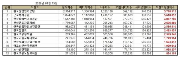 한국기업평판연구소는 고용노동부 공공기관 12개 브랜드에 대해 2025년 12월 15일부터 2026년 1월 15일까지의 고용노동부 공공기관 브랜드 빅데이터 31,828,109개를 분석한 결과 지난 12월 고용노동부 공공기관 브랜드 빅데이터 24,210,099개와 비교하면 31.47% 증가했다고 밝혔다.
