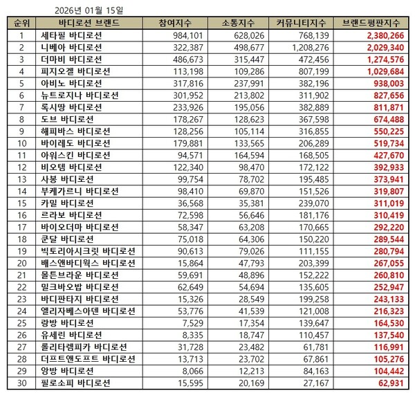 한국기업평판연구소는 2025년 12월 15일부터 2026년 1월 15일까지의 바디로션 브랜드 빅데이터 15,966,168개를 분석한 결과 지난 12월 브랜드 빅데이터 19,921,969개와 비교하면 19.86% 줄어들었다고 밝혔다.