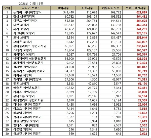 한국기업평판연구소는 국내 소비자에게 사랑받는 시니어 제품 브랜드 30개에 대해 2025년 12월 15일부터 2026년 1월 15일까지의 시니어 제품 브랜드 빅데이터 4,761,302개를 분석한 결과 지난 12월 시니어 제품 브랜드 빅데이터 4,445,391개와 비교하면 7.11% 증가했다고 밝혔다.