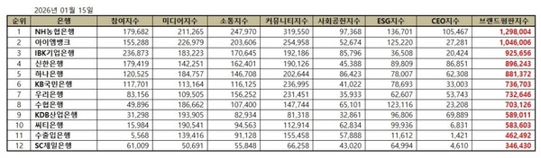 2026년 1월 은행 브랜드평판 빅데이터 분석 순위는 NH농협은행, 아이엠뱅크, IBK기업은행, 신한은행, 하나은행, KB국민은행, 우리은행, 수협은행, KDB산업은행, 씨티은행, 수출입은행, SC제일은행 순이었다.