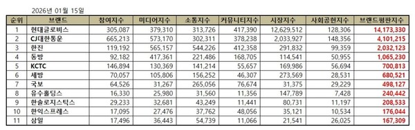 항공화물운송 상장기업 2026년 1월 브랜드평판...현대글로비스, CJ대한통운, 한진 順