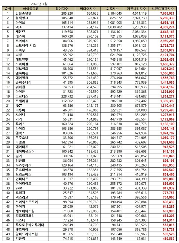 2026년 1월 아이돌그룹 브랜드평판 30위 순위는 방탄소년단, 블랙핑크, 아이브, 엑소, 세븐틴, 에스파, 트와이스, 스트레이 키즈, 마마무, 빅뱅, 레드벨벳, 오마이걸, 더보이즈, 엔하이픈, 에이핑크, 슈퍼주니어, 워너원, 아이들, 코르티스, 르세라핌, NCT, 비투비, 샤이니, 키키, 투어스, 라이즈 , 엔믹스, 우주소녀, 아일릿, 에이티즈 순으로 분석됐다.