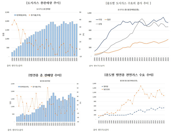 용도별 도시가스 판매량 추이를 나타낸 것으로, 전제적으로 보면, 2000년대 중반까지 압도적으로 큰 비중을 차지한 가정용 판매량이 2005년 이후 판매량이 성장세가 멈추고 정체된 모습을 볼 수 있다. 가정용 수요의 정체는 앞서도 언급했듯이 도시가스 보급이 전국적으로 안정세를 보이는 것에서 기인한다.