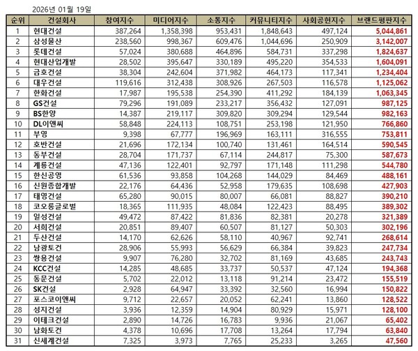 한국기업평판연구소는 2025년 12월 19일부터 2026년 1월 19일까지 건설회사 브랜드 31개의 빅데이터 24,264,748개를 분석하여 소비자들의 브랜드 참여와 소통량과 커뮤니티 지표, 브랜드에 대한 긍부정 비율을 측정한 결과 지난 12월 건설회사 브랜드 빅데이터 21,084,427개와 비교해보면 15.08% 증가했다고 밝혔다.