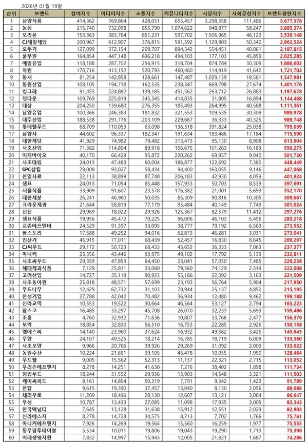 한국기업평판연구소는 식품 상장기업 60개 브랜드에 대해 2025년 12월 19일부터 2026년 1월 19일까지의 식품 상장기업 브랜드 빅데이터 43,526,004개를 분석한 결과 지난 12월 식품 상장기업 브랜드 빅데이터 52,580,051개와 비교하면 17.22% 줄어들었다고 밝혔다.