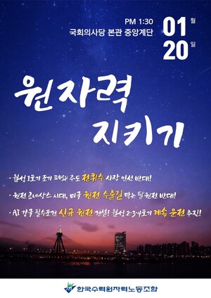 송고일 : 2026-01-19[에너지신문] 한국수력원자력 노동조합이 20일 국회의사당 본관 중앙계단에서 ‘원자력 지키기 및 전휘수 사장 후보 반대 결의대회’를 개최한다.