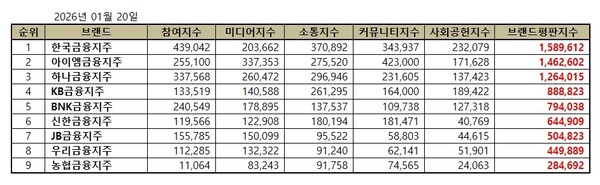 한국기업평판연구소는 2025년 12월 20일부터 2026년 1월 20일까지 금융지주회사 브랜드 빅데이터 7,883,403개를 분석하여 소비자들의 참여와 미디어, 소통, 커뮤니티, 사회공헌, 소비자지표로 금융지주회사 브랜드평판지수를 산출한 결과 지난 12월 금융지주회사 브랜드 빅데이터 10,063,249개와 비교하면 21.66% 줄어들었다고 밝혔다.