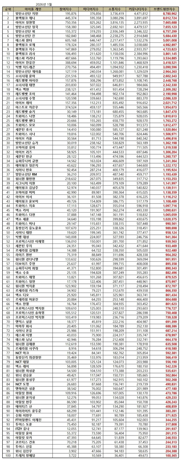 2026년 1월 아이돌 개인 브랜드평판 30위 순위는 방탄소년단 지민, 블랙핑크 제니, 아이브 장원영, 방탄소년단 정국, 방탄소년단 뷔, 방탄소년단 진, 에스파 윈터, 블랙핑크 로제, 블랙핑크 지수, 블랙핑크 리사, 에스파 카리나, 아이브 안유진, 빅뱅 지드래곤, 방탄소년단 제이홉, 소녀시대 윤아, 레드벨벳 아이린, 소녀시대 태연, 엑소 백현, 레드벨벳 조이, 소녀시대 수영, 아이브 레이, 아스트로 차은우, 레드벨벳 슬기, 트와이스 나연, 레드벨벳 웬디, 트와이스 모모, 세븐틴 호시, 트와이스 사나, 아이브 가을, 방탄소년단 슈가 순으로 분석됐다.