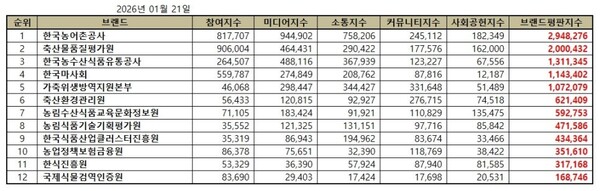한국기업평판연구소는 농림축산식품부 공공기관 12개 브랜드에 대해 2025년 12월 21일부터 2026년 1월 21일까지의 농림축산식품부 공공기관 브랜드 빅데이터 11,433,169개를 분석한 결과 지난 12월 농림축산식품부 공공기관 브랜드 빅데이터 14,238,126개와 비교하면 19.70% 줄어들었다고 밝혔다.