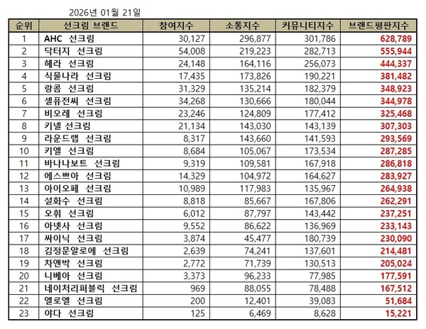 2026년 1월 선크림 브랜드평판 순위는 AHC, 닥터지, 헤라, 식물나라, 랑콤, 셀퓨전씨, 비오레, 키넬, 라운드랩, 키엘, 바나나보트, 에스쁘아, 아이오페, 설화수, 오휘, 아넷사, 싸이닉, 김정문알로에, 차앤박, 니베아, 네이처리퍼블릭, 엘로엘, 야다 선크림 순으로 분석됐다.