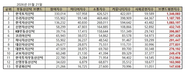 국내 부동산신탁 브랜드평판 2026년 1월 순위는 한국토지신탁, 우리자산신탁, 한국자산신탁, 신한자산신탁, KB부동산신탁, 코리아신탁, 하나자산신탁, 대신자산신탁, 대한토지신탁, 교보자산신탁, 한국투자부동산신탁, 신영부동산신탁, 무궁화신탁 순이었다.