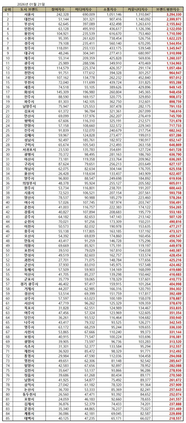 한국기업평판연구소는 2025년 12월 21일부터 2026년 1월 21일까지의 도시 브랜드 빅데이터 57,505,201개를 분석한 결과 지난 12월 도시 브랜드 빅데이터 60,311,171개와 비교하면 4.65% 줄어들었다고 밝혔다.