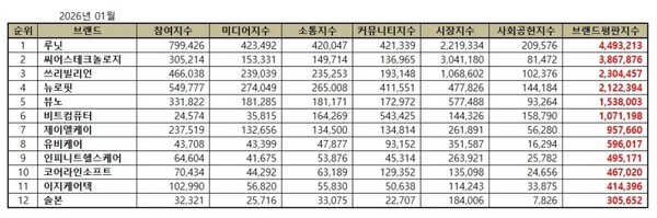 3위, 쓰리빌리언 브랜드는 참여지수 466,038 미디어지수 239,039 소통지수 235,253 커뮤니티지수 193,148 시장지수 1,068,602 사회공헌지수 102,376이 되면서 브랜드평판지수 2,304,457로 분석됐다. 지난 12월 브랜드평판지수 1,626,178과 비교해보면 41.71% 상승했다.