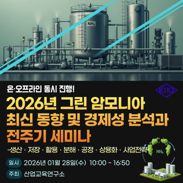 이러한 시기에 산업교육연구소는 오는 28일 ‘2026년 그린 암모니아 최신 동향 및 경제성 분석과 전주기 세미나’를 온·오프라인 동시 개최한다.