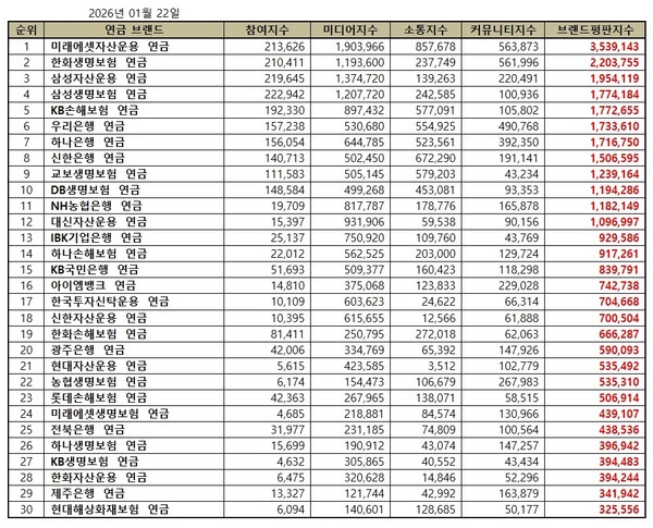 2026년 1월 연금 브랜드평판 30위 순위는 미래에셋자산운용, 한화생명보험, 삼성자산운용, 삼성생명보험, KB손해보험, 우리은행, 하나은행, 신한은행, 교보생명보험, DB생명보험, NH농협은행, 대신자산운용, IBK기업은행, 하나손해보험, KB국민은행, 아이엠뱅크, 한국투자신탁운용, 신한자산운용, 한화손해보험, 광주은행, 현대자산운용, 농협생명보험, 롯데손해보험, 미래에셋생명보험, 전북은행, 하나생명보험, KB생명보험, 한화자산운용, 제주은행, 현대해상화재보험 연금 순으로 나타났다.